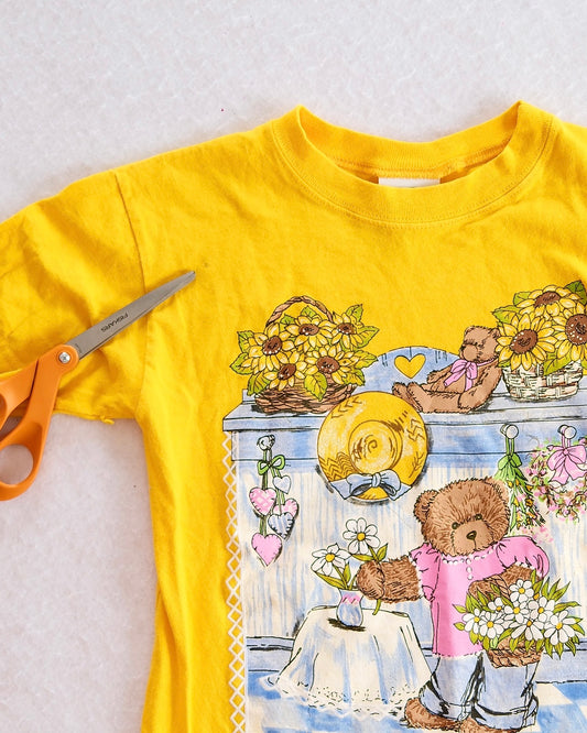 Vintage Yellow Teddy Bear Floral Kitchen Scene Kids T-Shirt: 7/8