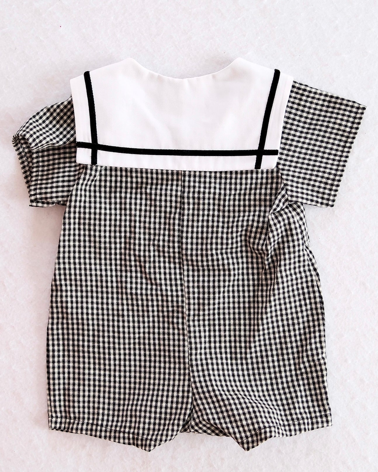 Modern boutique Monday’s Child baby romper in black and white gingham with contrast white collar and black trim detailing. Short sleeves, front buttons, and snap closures at the legs for easy changes. Lightweight cotton, tag size 3 months. Very little wear, if any.