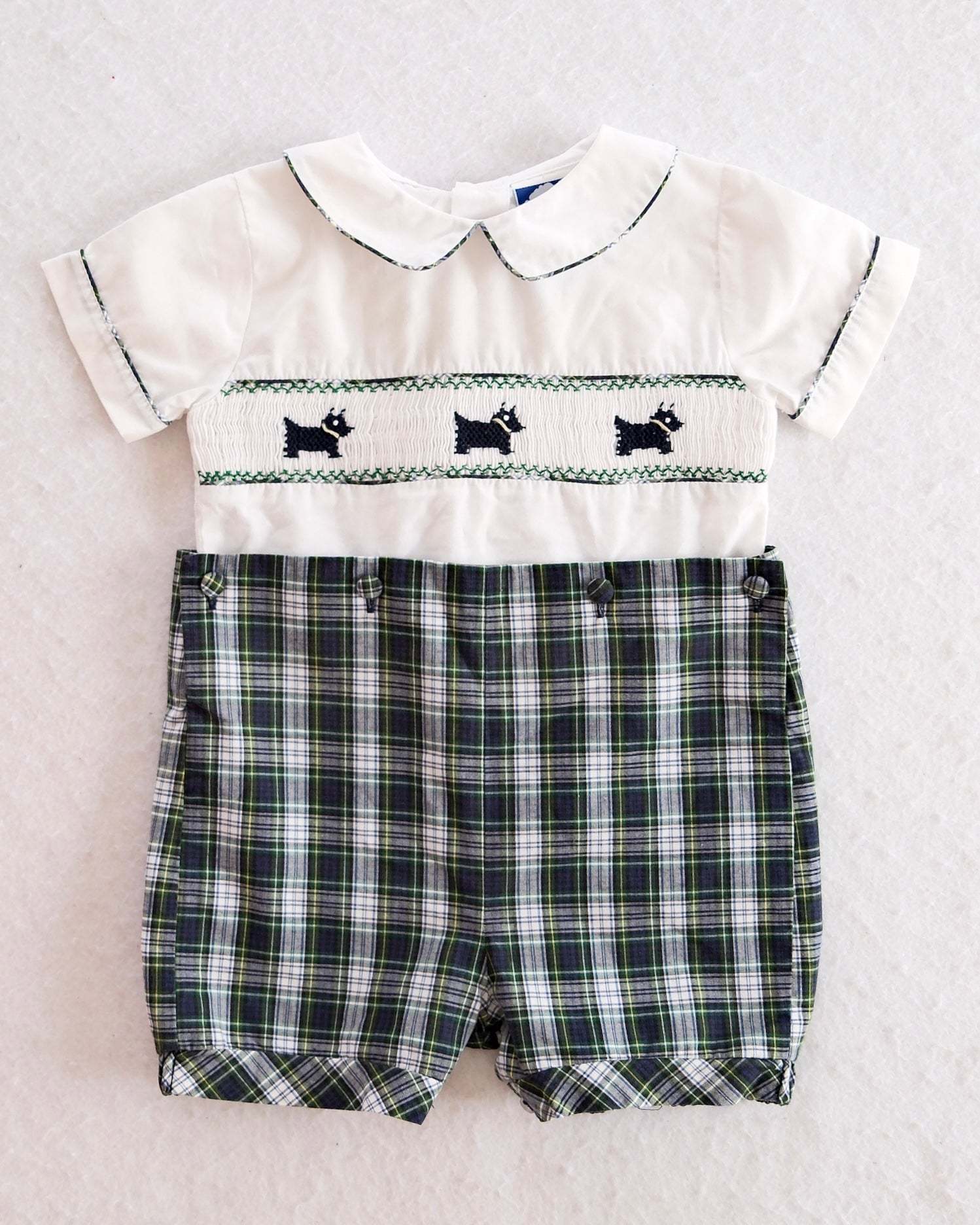 Heirloom Carriage Boutique Smocked Scottie Dog Baby Romper with Plaid Shorts: 12m