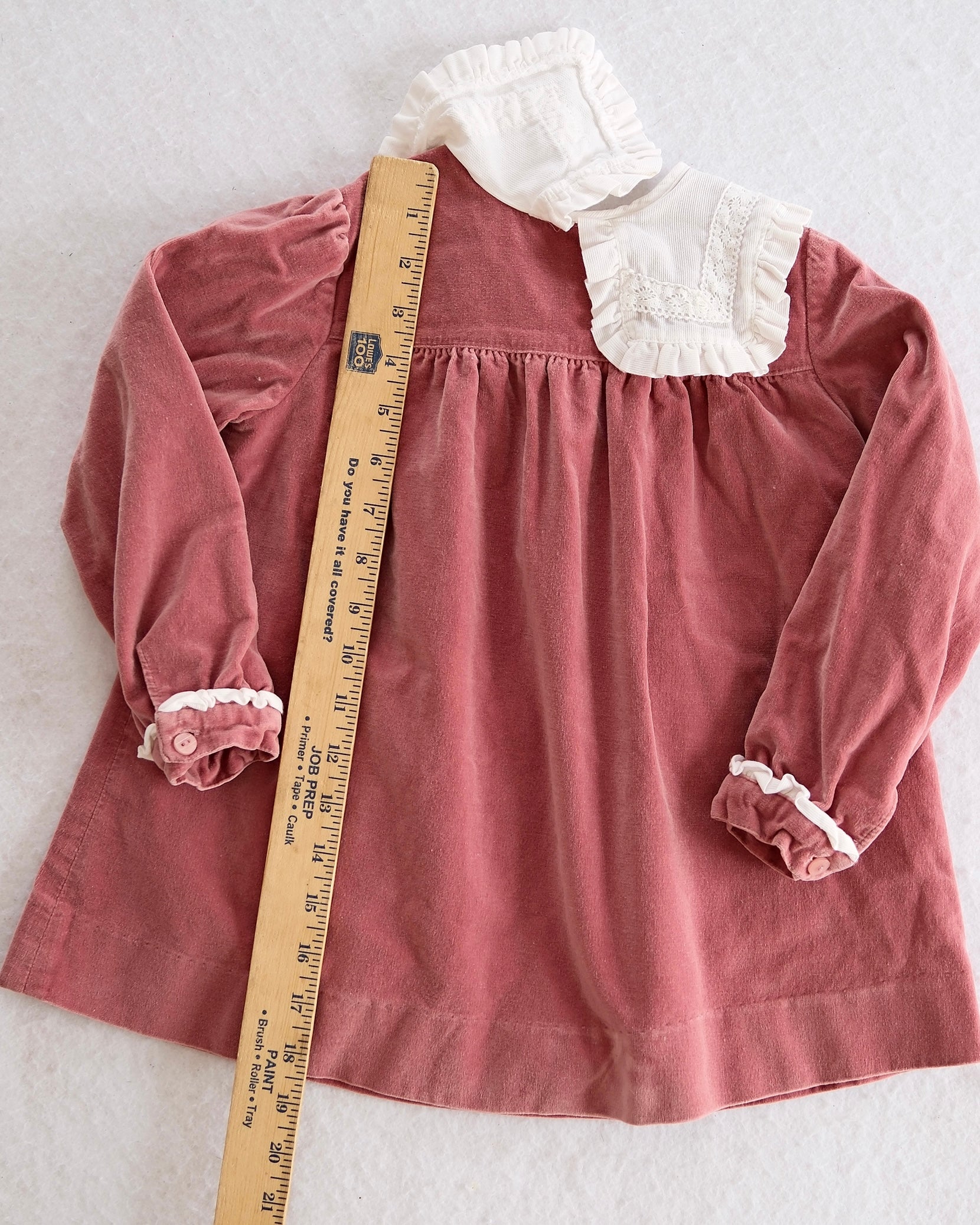 Vintage Cacharel toddler dress in soft dusty rose pink corduroy, tag size 4. This long sleeve dress features a gathered empire waist, delicate white lace ruffle collar, and matching trim at the cuffs. Size 4T with short vintage length, can work at 3T. Light wear + faint yellow spot on tip of collar.