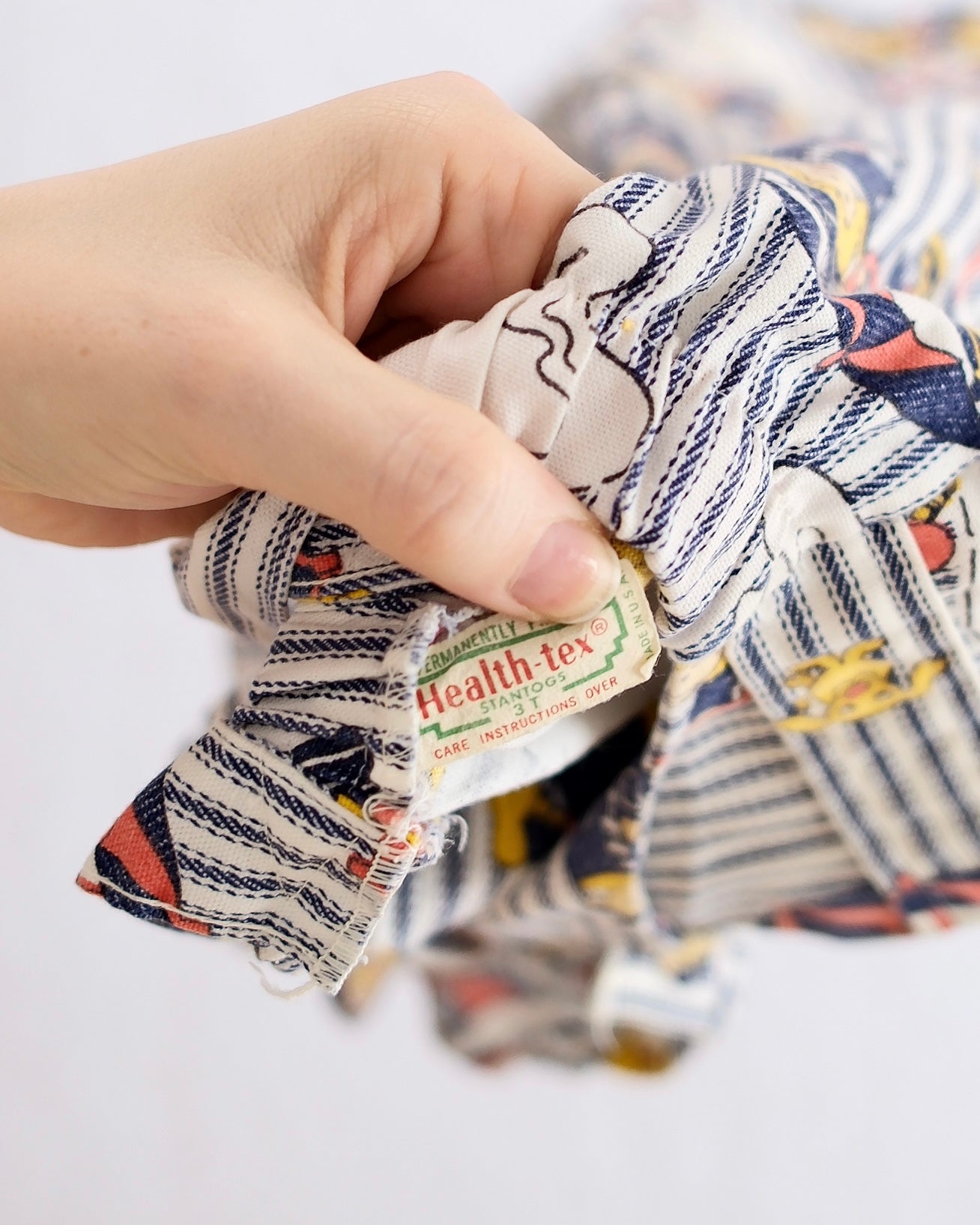 Vintage Healthtex 70s toddler overalls in blue and white stripe with whimsical storybook character and umbrella print, tag size 3T. Lightweight cotton construction with ruffled shoulder straps, yellow button closures, and straight-leg silhouette. Elastic at back of waist good, crease line at back of one leg, faint dot on bum. Reminds us of Morton Salt girl!