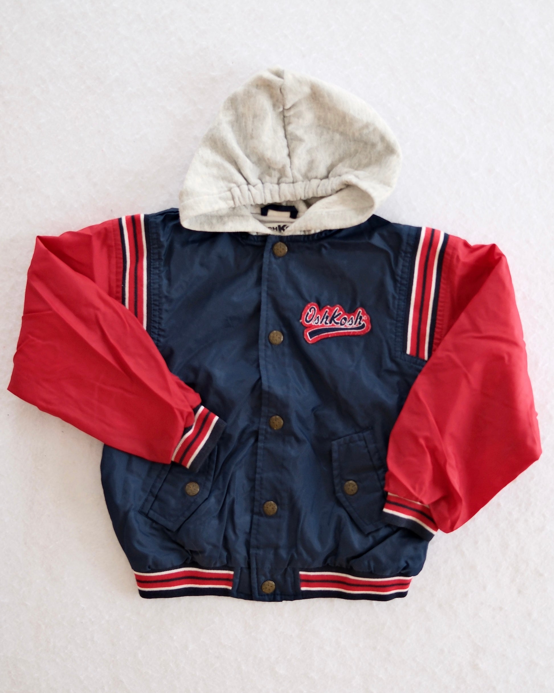 Vintage OshKosh B’gosh kids varsity-style jacket in classic red and navy with striped ribbed trim and an embroidered OshKosh logo at the chest, tag size 7. Features a cozy gray hood, snap-button front, and lightweight insulated feel—perfect for layering in cooler weather. Light wear only.