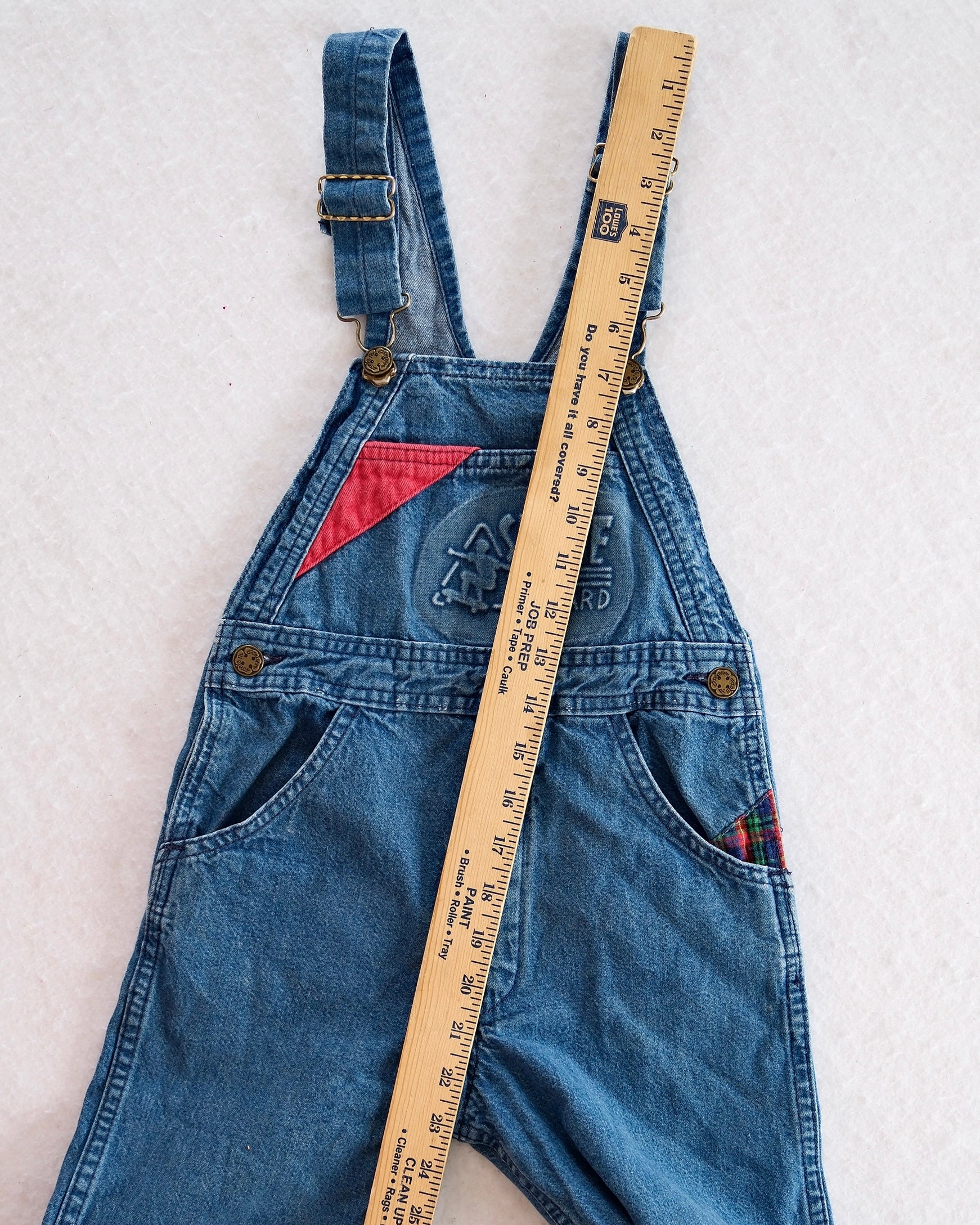 Vintage OshKosh 90s kids denim overalls with embossed skateboard patch and colorful accent details. Adjustable shoulder straps, classic bib front, and durable cotton denim construction. Size 7y, runs up to 7y, could work at 6y. Moderate fade on knees and light fade on bum.