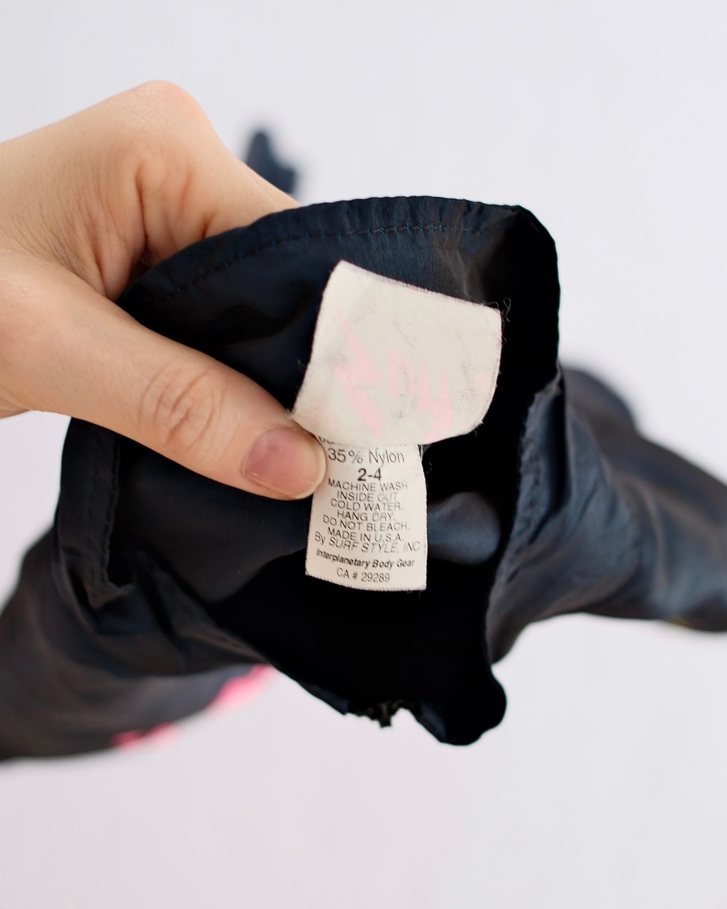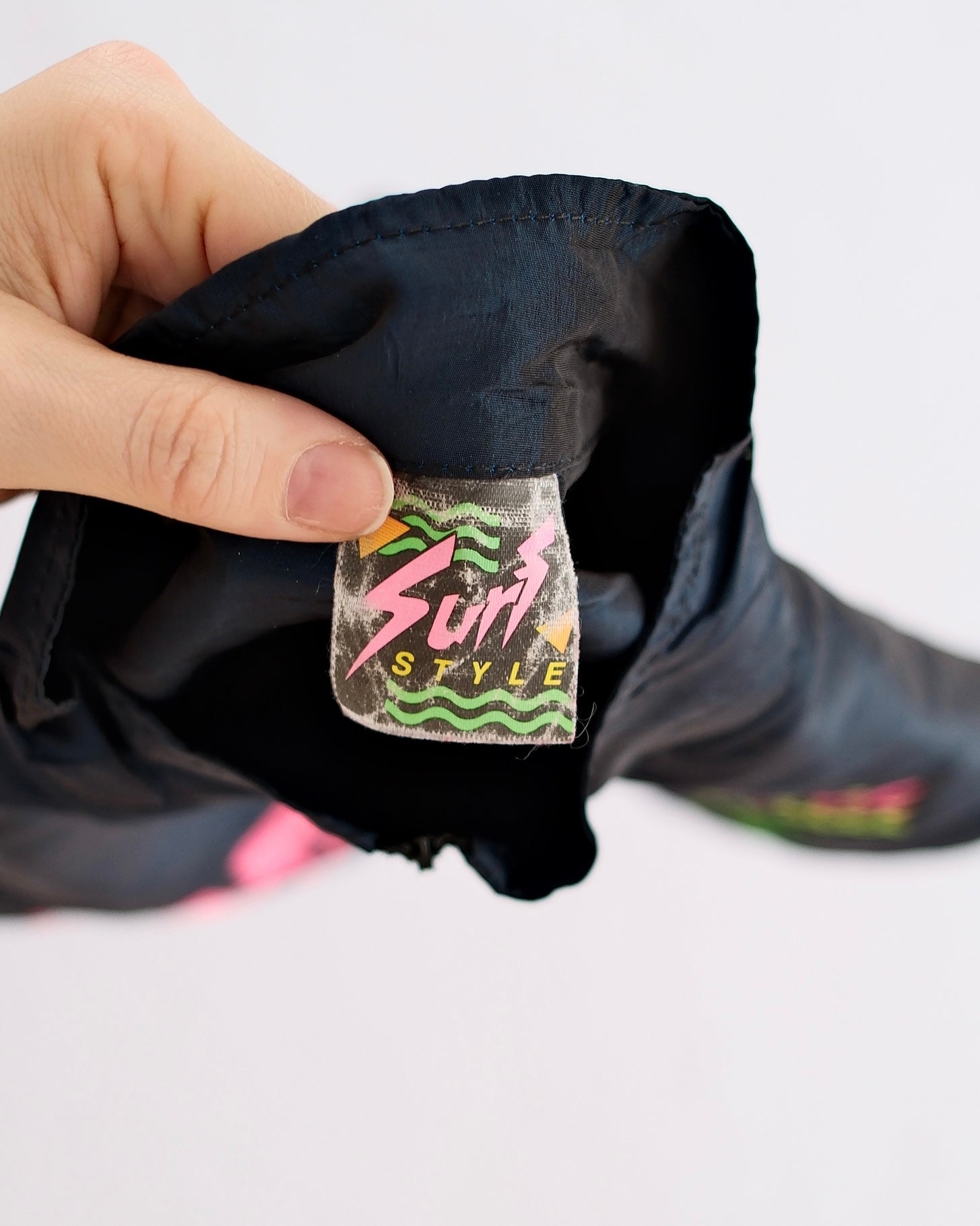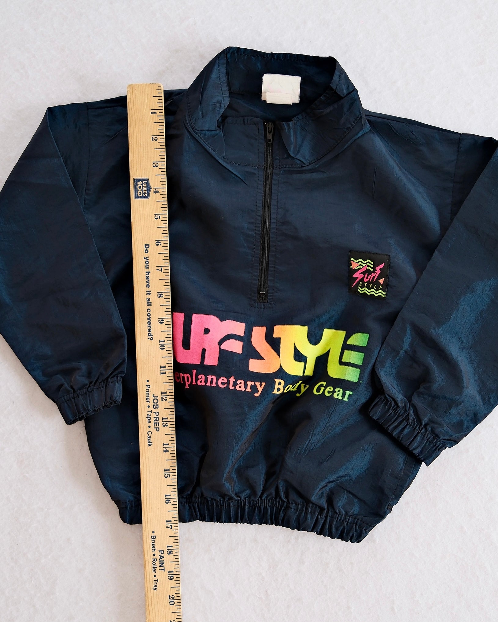 Vintage Surf Style kids nylon windbreaker pullover in iridescent deep navy with colorful gradient logo reading “Surf Style Interplanetary Body Gear,” tag size 2–4. Features a half-zip front, elastic cuffs and hem, and lightweight shell perfect for layering. Strong early-90s surf and streetwear vibe. Light wear only!